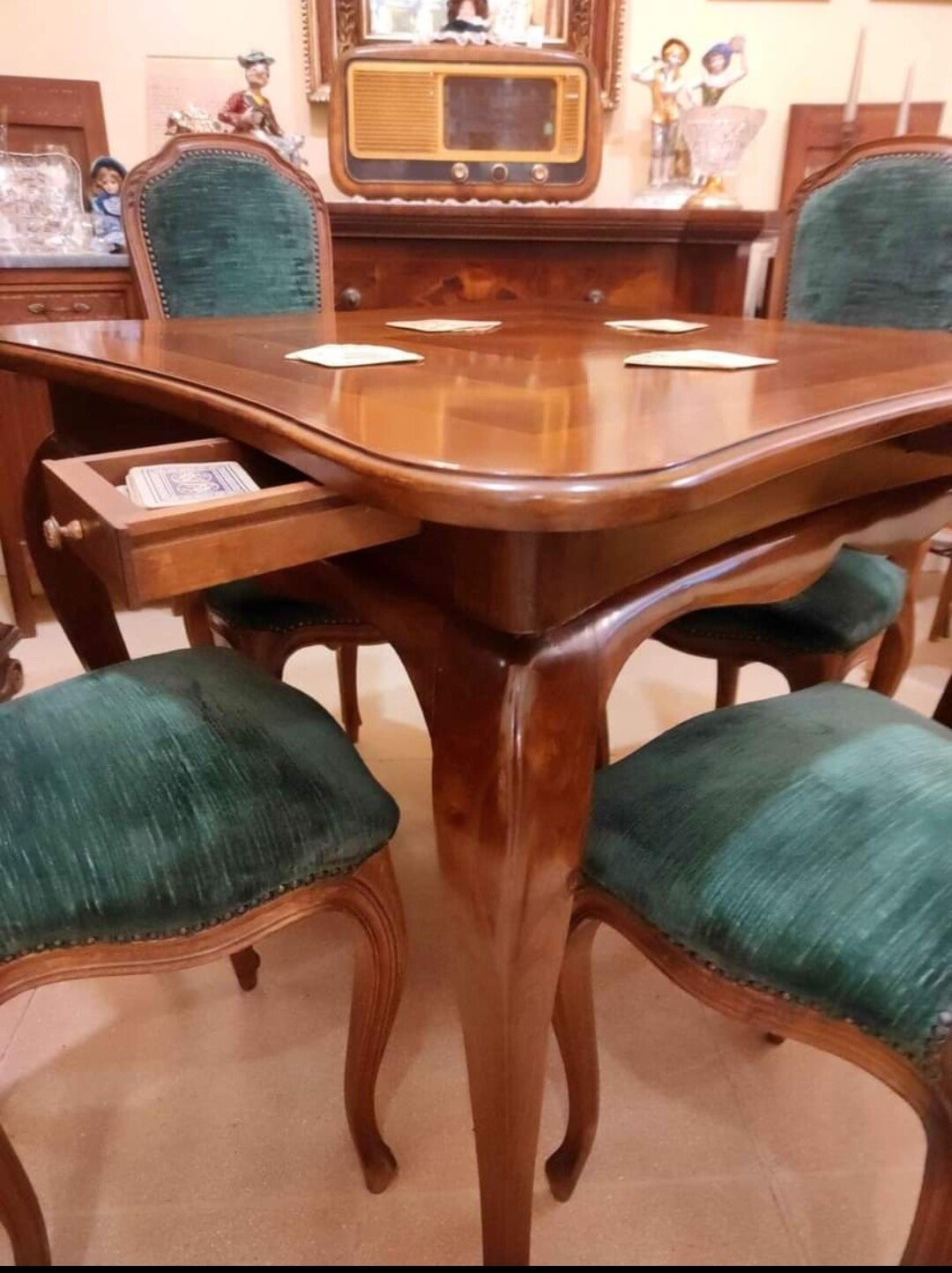 Stupendo tavolo da gioco in stile Chippendale anni 50, in legno di noce con intarsi a motivi geometrici, con 4 cassettini per le fiches e 4 splendide sedie rivestite con velluto verde ben conservato.