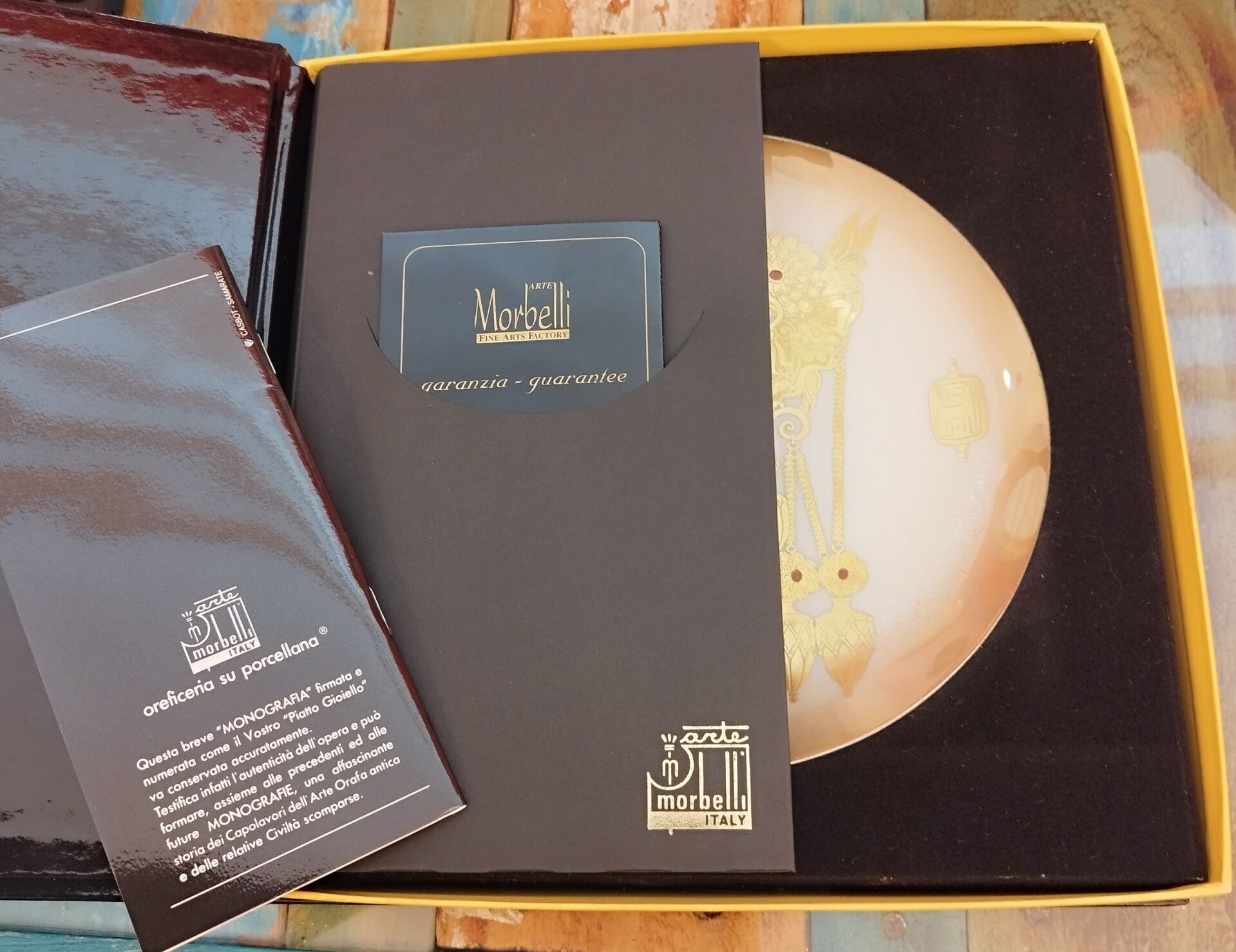 In porcellana, incisi ad acquaforte e lavorati a mano con decoro in oro zecchino e platino. Con scatola originale integra. Numerati con sigillo e certificato di garanzia. Perfetta idea regalo.