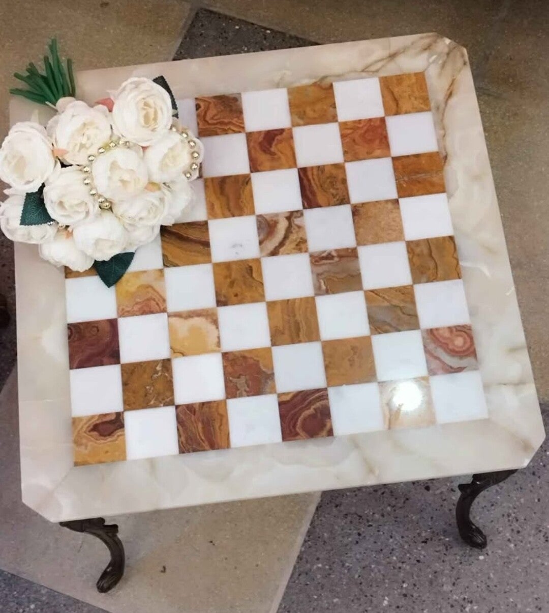 Tavolino e scacchi in marmo alabastro e ottone